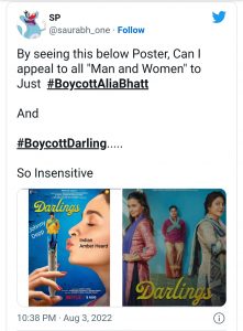 बॉलीवुड एक्ट्रेस आलिया भट्ट इन दिनों अपनी आने वाली फिल्म ‘डार्लिंग्स’ के प्रमोशन में जुटी हुई हैं। फिल्म नेटफ्लिक्स पर 5 अगस्त को रिलीज होने वाली हैं। ओटीटी पर ‘डार्लिंग्स’ से आलिया भट्ट डेब्यू कर रही हैं। आलिया भट्ट की फिल्म के कुछ पोस्टर सोशल मीडिया पर रिलीज किए गये हैं, जिसके बाद फिल्म सोशल मीडिया पर ट्रेंड हो रही हैं। फिल्म के ट्रेलर को अलग देखे तो उससे पचा चलता है कि आलिया भट्ट अपने पति के साथ घरेलू हिंसा करती हैं लेकिन बाहरी रूप से यह जाहिर करती है कि उनका शौहर उनपर हत्याचार करता हैं। उन्हें मारता-पीटता है लेकिन असलियत कुछ और होती हैं। फिल्म की आखिर में कहानी क्या है यह तो रिलीज के बाद ही पता चलेगी लेकिन इसके पोस्टर को लोख खास पसंद नहीं कर रहे हैं और फिल्म को बायकॉट करने की मांग कर रहे हैं। फिल्म के ओटीटी प्लेटफॉर्म पर उपलब्ध होने से ठीक एक दिन पहले हैशटैग #BoycottAliaBhatt ट्विटर पर ट्रेंड करने लगा।