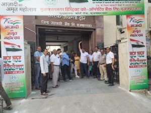जिला सहकारी बैंक लिमिटेड मुजफ्फरनगर के कर्मचारियों द्वारा दिनांक 18/08/2022 से वेतन पुनरीक्षण ना किए जाने के कारण सांकेतिक हड़ताल व प्रदर्शन काली पट्टी पहनकर प्रदर्शन किया जा रहा है गत 5 दिनों से प्रदेश की समस्त जिला सहकारी बैंकों के मुख्यालय पर उत्तर प्रदेश कोऑपरेटिव बैंक एम्पलाई यूनियन के आह्वान पर धरना प्रदर्शन किया जा रहा है अभी तक द्वारा कोई सकारात्मक सहयोग ना मिलने के कारण 23/08/2022 से कर्मचारियों द्वारा बैंक मुख्यालय पर पूर्णकालिक धरना व प्रदर्शन किया जाएगा आंदोलन को सफल बनाने में प्रांतीय अध्यक्ष श्री राजकुमार जी एवं यूनिट अध्यक्ष दीपक कुमार मंत्री अजीत सिंह कर्मचारी गण पंकज शर्मा विनय शर्मा दुर्विजय संदीप कुमार सतीश सैनी नीरज सिंह संजय सिंह भूपेंद्र सिंह आदि द्वारा पूरी तन्मयता से आंदोलन को सफल बनाने में सहयोग प्रदान किया गया