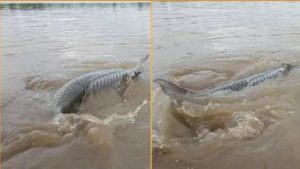 राजस्थान में बाढ़ के हालात हैं। बारिश के बाद कई बांध के गेट खोले गए हैं। ऐसे में मगरमच्छ और बड़ी मछलियों समेत कई जलीय जीव नदी में दिख रहे हैं। अब चंबल नदी में दो मीटर लंबी विशालकाय मछली दिखी है। जिसकी तस्वीर और वीडियो सोशल मीडिया पर वायरल हो रही है।