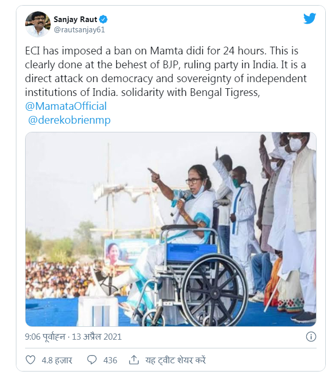 आयोग ने बनर्जी के केंद्रीय बलों के खिलाफ बयानों और कथित धार्मिक प्रवृत्ति वाले एक बयान के कारण उनके 24 घंटे तक चुनाव प्रचार करने पर रोक लगा दी है। राउत ने ट्वीट किया, ‘‘ईसीआई (भारत निर्वाचन आयोग) ने ममता दीदी पर 24 घंटे के लिए प्रतिबंध लगा दिया है। यह स्पष्ट रूप से भारत में सत्तारूढ़ पार्टी के कहने पर किया गया।’’ उन्होंने ट्वीट किया, ‘‘यह भारत में स्वतंत्र संस्थानों की सम्प्रभुता और लोकतंत्र पर सीधा हमला है। मैं बंगाल की शेरनी के प्रति एकजुटता व्यक्त करता हूं।’’ चुनाव प्रचार पर 24 घंटे के लिए पाबंदी लगाए जाने के निर्वाचन आयोग के फैसले की आलोचना करते हुए बनर्जी ने कहा कि वह आयोग के ‘‘असंवैधानिक फैसले’’ के खिलाफ मंगलवार को कोलकाता में धरना देंगी।