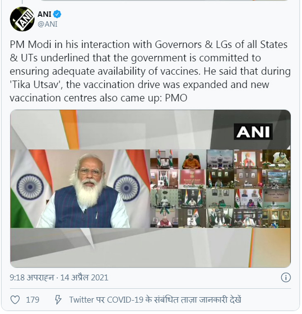 इस डिजिटल संवाद में प्रधानमंत्री के अलावा उपराष्ट्रपति एम वेंकैया नायडू, केंद्रीय गृह मंत्री अमित शाह और केंद्रीय स्वास्थ्य मंत्री हर्षवर्धन ने भी हिस्सा लिया। यह बैठक ऐसे समय में हुई है जब देश में कोरोना संक्रमण के मामलों में तेजी से इजाफा हुआ है। बुधवार को देश भर में संक्रमण के कुल 1.83 लाख मामले दर्ज किए गए। प्रधानमंत्री कार्यालय की ओर से जारी एक बयान के मुताबिक मोदी ने कहा कि टीकाकरण के साथ-साथ कोविड-19 के खिलाफ लड़ाई में मूल्य और दायित्व सबसे बड़ी ताकत हैं। उन्होंने कहा, ‘‘ऐसे में राज्यपालों की भूमिका बहुत महत्वपूर्ण हो जाती है। राज्य सरकारों और समाज के बीच बेहतर समन्वय सुनिश्चित करने का वे बेहतर माध्यम बन सकते हैं।’’ उन्होंने कहा, ‘‘सभी सामुदायिक संस्थाओं, राजनीतिक दलों, गैर सरकारी संगठनों (एनजीओ) और सामजिक संस्थानों की संयुक्त शक्ति का उपयोग करना जरूरी है।’’ प्रधानमंत्री ने कहा कि भारत के पास कोरोना वायरस के खिलाफ लड़ाई का पिछले साल का अनुभव है और साथ ही एक बेहतर स्वास्थ्य व्यवस्था भी। उन्होंने आरटी-पीसीआर जांच पर जोर दिया और कहा कि आज पीपीई किट और अन्य जरूरी उपकरणों के मामले में देश आत्मनिर्भर है। पिछले चार दिनों तक चले टीका उत्सव के सकारात्मक प्रभाव का उल्लेख करते हुए उन्होंने कहा कि इस दौरान टीकाकरण के दायरे का विस्तार किया गया और टीकाकरण केंद्रों की संख्या भी बढ़ाई गई। उन्होंने कहा कि सरकार टीकों की पर्याप्त उपलब्धता के लिए कटिबद्ध है। साथ ही यह जानकारी भी दी कि सबसे कम समय में तेजी से 10 करोड़ लोगों का टीकाकरण करने के मामले में भारत सबसे आगे रहा। उप राष्ट्रपति एम वेंकैया नायडू ने इस अवसर पर अपने संबोधन में सभी से आग्रह किया कि राजनीतिक मतभेदों को दरकिनार कर कोरोना वायरस महामारी को हराने के लिए टीम की तरह काम करें। उन्होंने कहा कि कोरोना वायरस से निपटने के लिए नयी ऊर्जा के साथ ‘जांच, नजर रखने और उपचार करने’ की सिद्ध एवं प्रामाणिक रणनीति को लागू करने की जरूरत है।