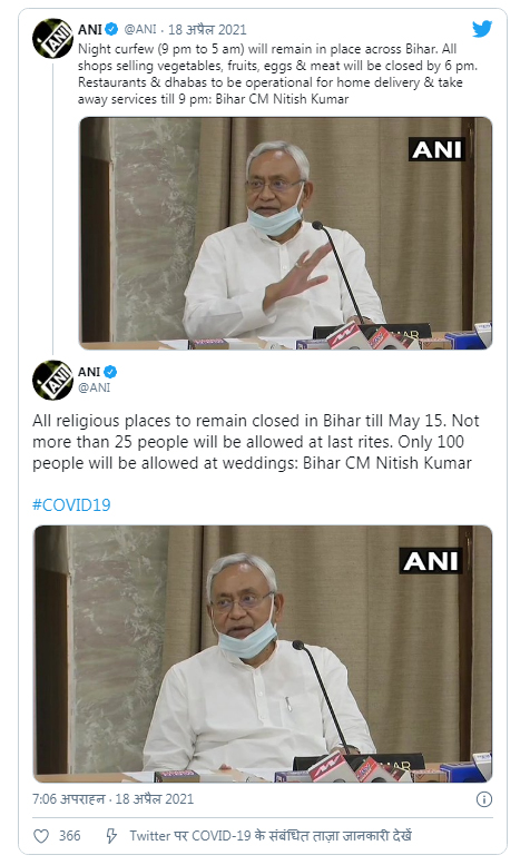 बिहार में रात नौ बजे से सुबह पांच बजे तक कर्फ्यू, स्कूल और कॉलेज 15 मई तक बंद