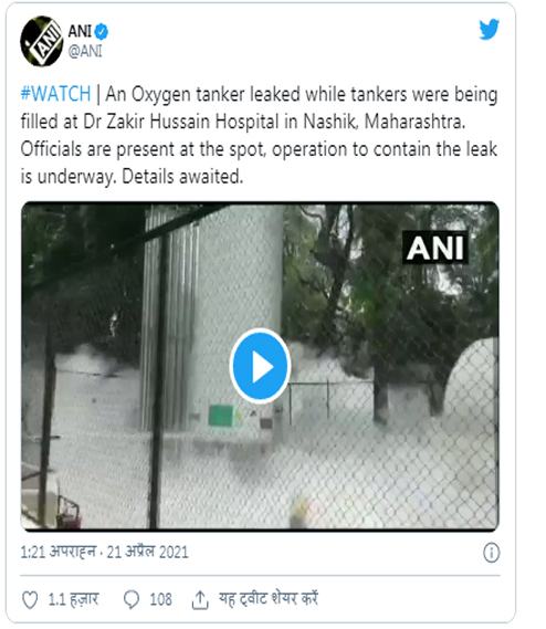 महाराष्ट्र के कई शहरों में ऑक्सीजन की भारी कमी के बीच, नासिक के ज़ाकिर हुसैन अस्पताल से ऑक्सीजन टैंक रिसाव की घटना सामने आ रही है। आपको बता दें कि आधे घंटे के लिए ऑक्सीज़न सप्लाई रोकने के कारण 10 मरीजों की मौत हो गई है। बता दें कि जब यह सप्लाई रोकी गई तब कई मरीज वेंटिलेटर पर थे। इम मामले को लेकर अब जांच शुरू हो गई है।