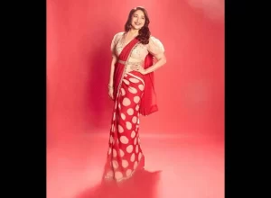 माधुरी दीक्षित का यह रेड साड़ी लुक भी काफी अलग है और करवाचौथ पर आपके लुक में एक्सफैक्टर एड कर सकता है। आप भी माधुरी दीक्षित की तरह रेड पोल्का डॉट साड़ी पहन सकती हैं। माधुरी ने इस लुक में बैलून स्लीव्स क्रीमी कलर के ब्लाउज को पेयर किया है। लेकिन आप फेस्टिवल लुक के लिए सीक्वेंस ब्लाउज को भी पहन सकती हैं। इवनिंग लुक को ध्यान में रखते हुए मेकअप को बोल्ड टच दिया जा सकता है।