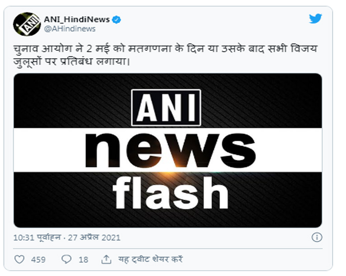 देश में बढ़ते कोरोना वायरस संक्रमण के मामलों के बीच 2 मई को पांच राज्यों के चुनावी नतीजे आने है। इसको देखते हुए चुनाव आयोग की ओर से कई अहम कदम उठाए गए है। 2 मई को जब पांच राज्यों में हुए विधानसभा चुनाव के नतीजे घोषित किए जाएंगे, उस दौरान किसी भी तरह के विजय जुलूस या जश्न पर चुनाव आयोग में पूरी तरह से पाबंदी लगा दी है। कोरोना वायरस संकट को देखते हुए चुनाव आयोग का यह फैसला काफी सख्त मारा जा रहा है। चुनाव आयोग ने यह भी कहा कि नतीजों के बाद कोई भी प्रत्याशी सिर्फ दो लोगों के साथ अपनी जीत का सर्टिफिकेट लेने जा सकता है।