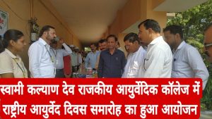 जनपद मुजफ्फरनगर के रामपुर स्थित स्वामी कल्याण देव राजकीय आयुर्वेदिक कॉलेज में सप्तम राष्ट्रीय आयुर्वेद दिवस समारोह के अवसर पर हर दिन हर घर आयुर्वेद कार्यक्रम का आयोजन किया गया। जिसके अंतर्गत जनपद स्तरीय भाषण प्रतियोगिता आयोजित की गई। जिसमें विभिन्न विद्यालयों के कक्षा 9 से 12 तक के लगभग 250 छात्र-छात्राओं ने प्रतिभाग किया। कार्यक्रम का शुभारंभ मुख्य अतिथि जिला पंचायत सदस्य डॉक्टर वीरपाल निर्वाल द्वारा किया गया ।जिसमें सर्वप्रथम भगवान श्री धन्वंतरी की वंदना की गई। भाषण प्रतियोगिता मे प्रतिभाग करने वाले छात्र-छात्राओं द्वारा दैनिक जीवन में आयुर्वेद की उपयोगिता एवं उसके उपयोग पर प्रकाश डाला गया। बताया गया कि हम अपने दैनिक जीवन में आयुर्वेद को अपनाकर निरोगी जीवन जी सकते हैं। छात्र छात्राओं ने आयुर्वेद को हमारे जीवन में एक वरदान बताया है।कार्यक्रम का संचालन अनुभव चौधरी व डॉ अरविंद कुमार द्वारा किया गया। कार्यक्रम में प्रथम द्वितीय एवं तृतीय आए छात्र छात्राओं को पुरस्कृत भी किया गया। साथ ही कार्यक्रम में उपस्थित अतिथियों द्वारा छात्र-छात्राओं का उत्साह वर्धन भी किया गया। वही कार्यक्रम में आयुर्वेद विद्या के प्रचार-प्रसार हेतु निजी औषधि निर्माताओं व आयुर्वेदिक यूनानी चिकित्सालय द्वारा स्टॉल भी लगाए गए। कार्यक्रम में बड़ी संख्या में गणमान्य लोग उपस्थित रहे।
