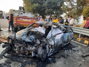 अनियंत्रित होकर कार हुई क्षतिग्रस्त ,कार में लगी आग, कार में मौजूद 2 लोगों की जलकर दर्दनाक मौत ,