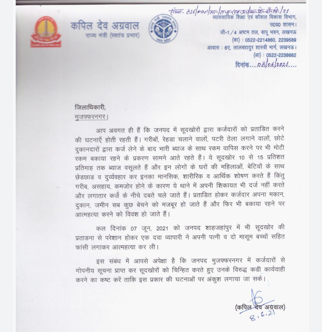 सूदखोरों पर लगाम लगाने के लिए राज्य मंत्री कपिल देव अग्रवाल ने पत्र जारी कर डीएम व एसएसपी को दिए निर्देश