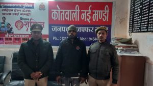अवगत कराना है कि जनपद मुजफ्फरनगर में वांछित/पुरुस्कार घोषित अपराधियों की गिरफ्तारी हेतु श्रीमान वरिष्ठ पुलिस अधीक्षक श्री विनीत जायसवाल महोदय के निर्देश में चलाए जा रहे अभियान के अन्तर्गत पुलिस अधीक्षक नगर व क्षेत्राधिकारी नई मण्डी के निकट पर्यवेक्षण तथा प्रभारी निरीक्षक थाना नई मण्डी के कुशल नेतृत्व में थाना नई मण्डी पुलिस द्वारा दौराने चेकिंग गैंगस्टर अभियोग में वांछित तथा 10 हजार के ईनामी अभियुक्त को पचेंडा रोड, गढी गाँव के पास से गिरफ्तार किया गया। अभियुक्त के कब्जे से 01 मोटरसाइकिल(थाना नई मण्डी पर पंजीकृत मु0अ0सं0 505/22 धारा 379/411 भादवि से सम्बन्धित) तथा 01 तमंचा मय 01 जिंदा कारतूस 315 बोर बरामद किया गया। गिरफ्तार अभियुक्त थाना नई मण्डी पर पंजीकृत मु0अ0सं0 185/22 धारा 2/3 गैगंस्टर अधि0 में वांछित चल रहा था जिसकी गिरफ्तारी हेतु वरिष्ठ पुलिस अधीक्षक महोदय द्वारा 10 हजार रुपये का पुरुस्कार घोषित किया गया था। अभियुक्त की गिरफ्तारी एवं बरामदगी के सम्बन्ध में थाना नई मण्डी पुलिस द्वारा अग्रिम आवश्यक वैधानिक कार्यवाही की जा रही है।