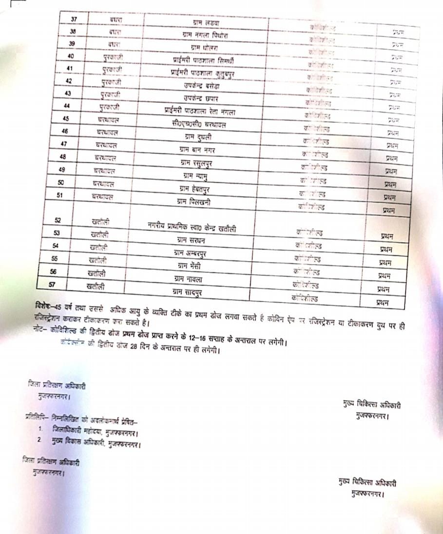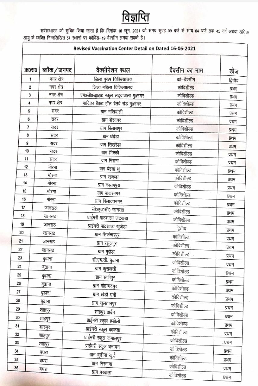 देखिए मुजफ्फरनगर में 16 जून को 45 वर्ष से अधिक आयु वर्ग के लोगों के लिए होने वाले वैक्सीनेशन केंद्रों की जानकारी