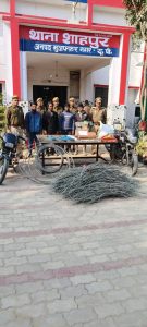 मुजफ्फरनगर एसएसपी संजीव सुमन के निर्देशन में थाना शाहपुर पुलिस ने नलकूप व विद्युत लाइनो से तारो की चोरी करने वाले शातिर चोर गिरोह का पर्दाफाश किया है।शाहपुर पुलिस ने मुठभेड के दौरान लाइनमैन सहित चार शातिर अन्तरजनपदीय चोरो को गिरफ्तार किया हैं दरअसल वरिष्ठ पुलिस अधीक्षक द्वारा विद्युत लाइनो से तार व नलकूपो से स्ट्रार्टर एंव केबिल आदि चोरी करने वाले अपराधियो के विरूद्ध चलाये जा रहे अभियान के अन्तर्गत पुलिस अधीक्षक देहात व श्रीमान क्षेत्राधिकारी बुढाना के निर्देशन मे थानाध्यक्ष कर्मवीर सिंह के नेतृत्व में हरसौली चौकी प्रभारी मोहित तेवतिया के नेतृत्व में थाना शाहपुर पुलिस के द्वारा रात्रि मुठभेड के दौरान चार शातिर चोरो को गिरफ्तार करने में सफलता प्राप्त की है।पकड़े गए चोरो ने अपने नाम लाइनमैन राजेश पुत्र राजपाल निवासी ग्राम भविसा थाना कांधला जनपद शामली,पारूल पुत्र कुंवरपाल कश्यप निवासी ग्राम हरसौली थाना शाहपुर जनपद मु0नगर,अरविन्द पुत्र प्रकाश निवासी ग्राम विराल थाना बुढाना जनपद मु0नगर,आरिफ पुत्र आसक अली निवासी ग्राम सुन्ना थाना काधला जनपद शामली बताया जिनके पास से लाइन काटने के उपकरण, नाजायज असलाह कारतूस व चाकू बरामद हुआ है । गिरफ्तार अभियुक्तगण की निशादेही पर विद्युत लाइनो से काटा गया तार व ट्यूबैलो से चोरी किये गये स्ट्रार्टर व कटआउट एव केबिल आदि कुटबा जंगल से बरामद हुआ है गिरफ्तार अभियुक्तगण के द्वारा थाना शाहपुर के हरसौली क्षेत्र में पिछले साल जुलाई के महीने में कावड के समय नाले की पटरी पर बिजली की लाइन को दो बार मे करीब 15-20 खम्मो से तार काटकर चोरी किये थे – थाना शाहपुर पुलिस द्वारा किये गये सराहनीय कार्य की आमजन व उच्चाधिकारियो द्वारा प्रशंसा की गयी है उपरोक्त कार्य से निश्चित रूप से चोरी की घटनाओ के अपराध पर अंकुश लगेगा