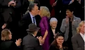 अमेरिका की प्रथम महिला जिल बाइडेन द्वारा कमला हैरिस के पति डौग एम्हॉफ को लिप-टू-लिप किस करने का एक वीडियो सोशल मीडिया पर वायरल हो रहा हैं। ऑनलाइन वीडियो सामने आने के बाद से इंटरनेट पर हलचल मच गई है। यह घटना मंगलवार को राष्ट्रपति जो बाइडेन के स्टेट ऑफ द यूनियन संबोधन से पहले हुई। ट्विटर पर शेयर की गई क्लिप ऑनलाइन वायरल हो गई है।