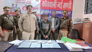 जनपद मुजफ्फरनगर में शातिर चोर/लूटेरे अभियुक्तगण की गिरफ्तारी हेतु वरिष्ठ पुलिस अधीक्षक श्री संजीव सुमन महोदय के निर्देशन में चलाये जा रहे धरपकड अभियान के अन्तर्गत पुलिस अधीक्षक नगर श्री अर्पित विजयवर्गीय के पर्यवेक्षण में एवं क्षेत्राधिकारी नईमण्डी श्री हिमांशु गौरव कुशल नेतृत्व में आज दिनांक 18.02.2023 को थाना नईमण्डी पुलिस द्वारा शादी/पार्टियों में शामिल होकर लोगों के पर्स चोरी करने वाले गिरोह का पर्दाफाश करते हुए 03 अभियुक्तों को पचेण्डा पुल हाईवे से आगे मुस्तफाबाद कट से गिरफ्तार किया गया। गिरफ्तार अभियुक्त के कब्जे से चोरी किए गए 5200/रूपये, 02 तमंचे मय 04 जिन्दा कारतूस .315 बोर, 01 नाजायज चाकू, ड्राईविंग लाईसेंस व आधार कार्ड बरामद किया गया। गिरफ्तारी एवं बरामदगी के सम्बन्ध में थाना नईमण्डी पुलिस द्वारा अग्रिम वैधानिक कार्यवाही की जा रही है।