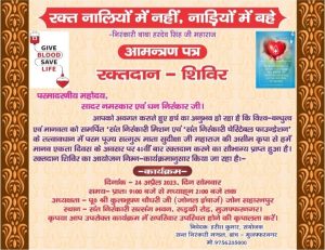 उपरोक्त जानकारी देते हुए मीडिया सहायक सुशील कुमार ‘ अंश ‘ ने बताया कि इस वर्ष भी सत्गुरू माता सुदीक्षा जी महाराज की असीम कृपा से मुजफ्फरनगर में 41वें रक्तदान शिविर का आयोजन 24 अप्रैल 2023, दिन सोमवार को प्रातः 9 बजे से दोपहर 2 बजे तक रूड़की रोड स्थित स्थानीय सन्त निरंकारी सत्संग भवन के प्रांगण में किया जायेगा, जिसमें जिला चिकित्सालय से डॉक्टरों की टीम रक्त संग्रह करेगी।