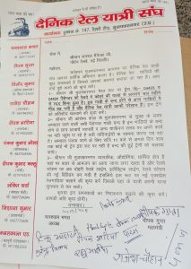 आज दैनिक रेल यात्री संघ का प्रतिनिधिमंडल नॉर्दन रेलवे के जनरल मैनेजर श्री शोभान चौधरी जी से मिला और उनको दैनिक रेल यात्रियों की समस्याओं से अवगत कराया गया रेलवे विभाग ने जो अंबाला जाने वाली पैसेंजर के बंद कर रखी है फिर से चलाने का आग्रह किया गया सहारनपुर दिल्ली डीएम पैसेंजर गाड़ी बंद की हुई है उसको भी जल्द से जल्द चल वाने के लिए कहा रेलवे के जनरल मैनेजर महोदय ने दैनिक रेल यात्री संघ के अध्यक्ष घनश्याम भगत वे उनकी पूरी टीम को रेलवे स्टेशन अधीक्षक के ऑफिस में बुलाकर सारी समस्याएं सुनी गई यह सभी का बड़ा सम्मान किया सभी का परिचय प्राप्त किया कौन क्या कार्य करता है यह सब पूछा मौके पर मौजूद रेलवे के डीआरएम महोदय ने सभी का परिचय कराया और उन्होंने आश्वासन दिया की दैनिक रेल यात्रियों को कोई भी दिक्कत नहीं होने दी जाएगी दैनिक रेल यात्री संघ के अध्यक्ष घनश्याम भगत महामंत्री दीपक गुप्ता ने अपने साथियों के साथ जनरल मैनेजर महोदय को गुलदस्ता देकर मुजफ्फरनगर आगमन पर उनका आभार प्रकट किया इस अवसर पर अध्यक्ष घनश्याम भगत महामंत्री दीपक गुप्ता सरदार टिंकू सिंह वरिष्ठ नेता सुरेंद्र मित्तल पारस भैया विनोद ठाकुर निशांत गुप्ता दीपक अग्रवाल राजू भाटिया दीपक भाटिया जी आदि साथी उपस्थित रहे