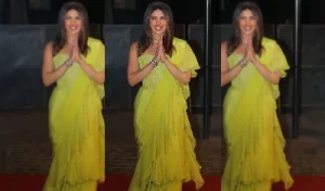 परिणीति और राघव के सगाई समारोह में प्रियंका चोपड़ा एक पिली रंग की रफल्ड साड़ी पहने नजर आयीं। हमेशा की तरह इस बार भी अभिनेत्री अपने देसी अवतार में बेहद खूबसूरत लग रही थी। सोशल मीडिया यूजर्स को प्रियंका का देसी अवतार काफी पसंद आ रही है। अभिनेत्री की तस्वीरें सोशल मीडिया पर छायी हुई हैं और लोग जमकर उनकी और उनके लोग की तारीफ़ कर रहे हैं।