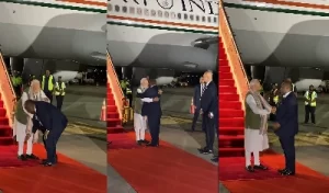 बता दें कि जैसे ही प्रधानमंत्री नरेंद्र मोदी एयरपोर्ट पर पहुंचे और प्लेन से नीचे उतरे तो उनका स्वागत प्रधानमंत्री जेम्स मारापे ने किया। इस दौरान उन्होंने प्रधानमंत्री नरेंद्र मोदी का पैर छूकर स्वागत किया। बता दें कि यह किसी भी भारतीय प्रधानमंत्री द्वारा पापुआ न्यू गिनी की पहली यात्रा है। प्रधानमंत्री जापान से यहां पहुंचे जहां उन्होंने जी-7 के शिखर सम्मेलन में भाग लिया और दुनिया के कई नेताओं के साथ द्विपक्षीय बैठकें कीं।