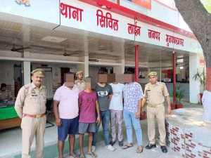 अवगत कराना है कि जनपद मुजफ्फरनगर में अवैध रुप से सट्टा/जुआ खेलने वाले अभियुक्तगण की गिरफ्तारी हेतु वरिष्ठ पुलिस अधीक्षक श्री संजीव सुमन महोदय के निर्देशन में चलाये जा रहे अभियान के अन्तर्गत पुलिस अधीक्षक नगर श्री सत्यनारायण प्रजापत के कुशल पर्यवेक्षण तथा सहायक पुलिस अधीक्षक/क्षेत्राधिकारी नगर श्री आयुष विक्रम सिंह व थाना प्रभारी सिविल लाइन श्री बबलू सिंह के कुशल नेतृत्व में थाना सिविल लाइन पुलिस द्वारा अवैध रुप से जुआ खेल रहे 05 अभियुक्तगण को 91 गाजावाली से गिरफ्तार किया गया। अभियुक्तगण के कब्जे से 19,750/- रुपये नगद व 52 ताश के पत्ते बरामद किये गये। अभियुक्तगण की गिरफ्तारी व बरामदगी के सम्बन्ध में थाना सिविल लाइन पुलिस द्वारा अग्रिम विधिक कार्यवाही की जा रही है।