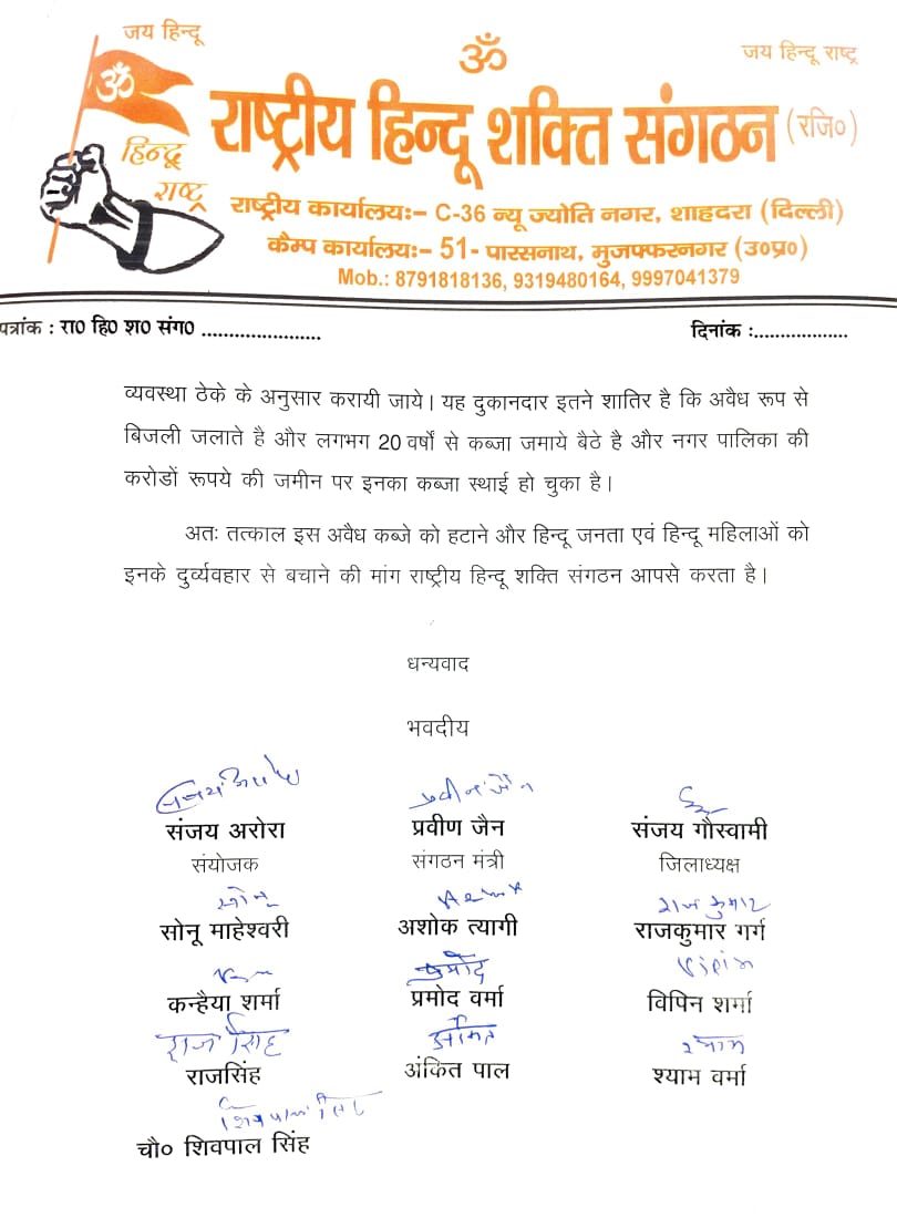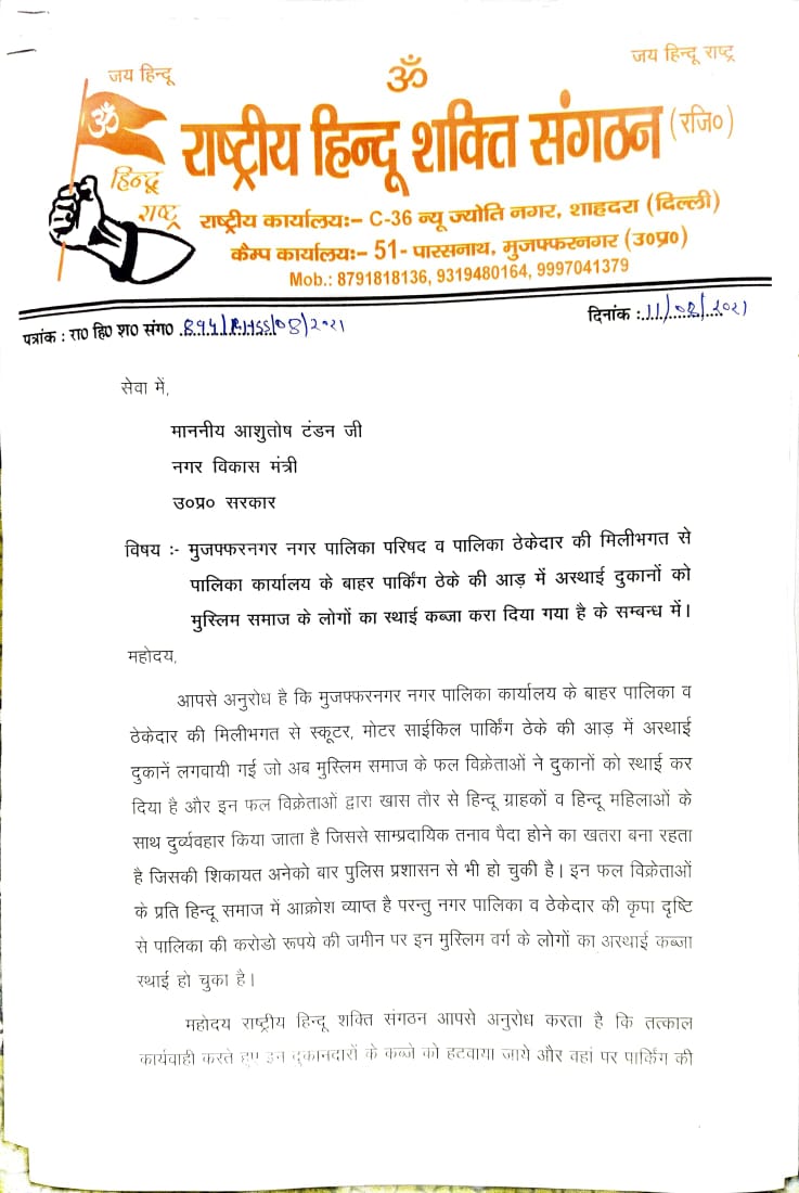 ज्ञापन में मुजफ्फरनगर नगर पालिका परिषद व पालिका ठेकेदार की मिलीभगत से पालिका कार्यालय के बाहर पार्किंग ठेके की आड़ में अस्थाई दुकानों को मुस्लिम समाज के लोगों का स्थाई कब्जा करा दिया गया है के संबंध में ज्ञापन प्रेषित किया जिसमें माननीय मंत्री महोदय से अनुरोध किया गया कि मुजफ्फरनगर नगर पालिका कार्यालय के बाहर पालिका व ठेकेदार की मिलीभगत से स्कूटर मोटरसाइकिल पार्किंग के ठेके की आड़ में अस्थाई दुकानें लगाई गई है जो अब मुस्लिम समाज के फल विक्रेताओं ने दुकानों को स्थाई कर दिया है और इन फल विक्रेताओं द्वारा खासतौर से हिंदू ग्राहकों व हिंदू महिलाओं के साथ दुर्व्यवहार किया जाता है जिससे सांप्रदायिक तनाव पैदा होने का खतरा बना रहता है जिसकी शिकायत अनेक बार पुलिस प्रशासन से भी हो चुकी है इन फल विक्रेताओं के प्रति हिंदू समाज में आक्रोश व्याप्त है परंतु नगरपालिका व ठेकेदार की कृपा दृष्टि से पालिका की करोड़ों रुपए की जमीन पर इन मुस्लिम वर्ग के लोगों का अस्थाई कब्जा स्थाई हो चुका है महोदय राष्ट्रीय हिंदू शक्ति संगठन आपसे अनुरोध करता है की तत्काल कार्रवाई करते हुए इन दुकानदारों के कब्जे से मुक्ति दिलाई जाए और वहां पर पार्किंग की व्यवस्था ठेका के अनुसार कराई जाए यह दुकानदार इतने शातिर हैं कि अवैध रूप से बिजली जलाते हैं और लगभग 20 वर्षों से कब्जा जमाए बैठे हैं और नगरपालिका की करोड़ों रुपए की जमीन पर उनका कब्जा स्थाई हो चुका है