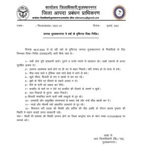 अब सभी को अवगत कराना है कि भारत मौसम विज्ञान विभाग, मौसम विभाग लखनऊ द्वारा जारी मौसम चेतावनी द्वारा जनपद मुजफ्फरनगर में भारी वर्षा के आशंका जताई गई है जिससे आप सभी को विनम्र अनुरोध है कि घर से बाहर न निकले एवं रहने के लिए सुरक्षित स्थान का चिन्हित करे साथ ही पालतू पशु को भी सुरक्षित स्थान पर रखें एवं किसी आपातकाल स्थिति में जिला कंट्रोल रूम 01312436918 एवं 9412210080 में संपर्क करे ।