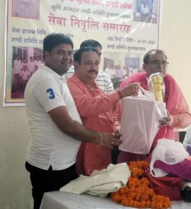 कृषि उत्पादन मंडी समिति मुजफ्फरनगर के सचिव श्री सुरेंद्र शर्मा के सेवानिवृत्त प्रोग्राम में उपस्थित होकर सुरेंद्र शर्मा जी को उनके परिवार को बधाई और शुभकामनाएं दी संजय मिश्रा अध्यक्ष नवीन मन्डी व्यापार संघ ने कहा कि आपने अपने 37 वर्ष के कार्यकाल में व्यापारियो की सेवा की अब आप अपने परिवार के बीच मे अपना समय हर्षोल्लास से व्यतीत करें सभी मन्डी समिति के सम्मानित कर्मचारी ने भी बिदाई समारोह का आयोजन अच्छी तरह से किया इसमें मंडी समिति के सभापति सिटी मजिस्ट्रेट विकास कश्यप जी संजय मितल श्याम सिंह सैनी मनीष चौधरी दिनेश राठी कुश कुच्छल धर्मवीर बालियान धर्मेन्द्र धनसिंह राहुल राठी सचिन सतेन्द्र सिंह विपिन कुमार अनुज कुमार सुनील शर्मा प्रमोद शर्मा आदि उपस्थित रहे,