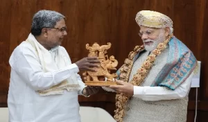कर्नाटक के मुख्यमंत्री सिद्धारमैया ने गुरुवार को दिल्ली में प्रधानमंत्री नरेंद्र मोदी से मुलाकात की। प्रधानमंत्री से मुलाकात से कुछ घंटे पहले मुख्यमंत्री ने रक्षा मंत्री राजनाथ सिंह से भी मुलाकात की। सिद्धारमैया ने पीएम मोदी को लकड़ी से बनी पारंपरिक हाथी की लघु प्रतिमा और माला भेंट की। पीएमओ द्वारा ट्वीट की गई तस्वीर में पीएम मोदी कर्नाटक की पारंपरिक पगड़ी और शॉल पहने नजर आ रहे हैं। रक्षा मंत्री राजनाथ सिंह से सिद्धारमैया की मुलाकात संसद भवन में हुई। मई में विधानसभा चुनाव में जीत के बाद राज्य में उनके नेतृत्व में कांग्रेस की सरकार बनने के बाद प्रधानमंत्री के साथ यह उनकी पहली मुलाकात थी।