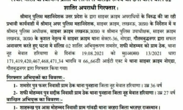 हरियाणा के नूह मेवात इलाके के रहने वाले शमशेर, शफी मोहम्मद को साइबर क्राइम टीम ने नोएडा से किया गिरफ्तार