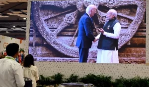 प्रधानमंत्री नरेंद्र मोदी ने जी20 शिखर सम्मेलन में पहुंचे विश्व नेताओं को शुभकामनाएं दीं। मगर इसके अलावा अगर किसी चीज ने ध्यान खिंचा है तो वो था वायरल हो रही फोटो का बैकग्राउंड, यानी हर फोटो में ओडिशा के पुरी स्थित कोणार्क के सूर्य मंदिर में बने चक्र दिखाई दिया। इस चक्र पर सभी की निगाहें टिकी रही। कोणार्क सूर्य मंदिर के इस चक्र की प्रतिकृति लगी थी, जिसने स्वागत स्थल की शोभा बढ़ाई है।