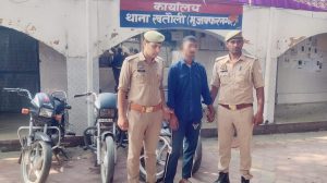 जनपद मुजफ्फरनगर में शातिर चोर/लूटेरे अभियुक्तगण की गिरफ्तारी हेतु वरिष्ठ पुलिस अधीक्षक संजीव सुमन के निर्देशन में चलाये जा रहे अभियान के अर्न्तगत पुलिस अधीक्षक नगर सत्यनारायण प्रजापत के निकट पर्यवेक्षण तथा क्षेत्राधिकारी खतौली डा0 रविशंकर एवं प्रभारी निरीक्षक थाना खतौली मुकेश कुमार के कुशल नेतृत्व में दिनांक 22.09.2023 को थाना खतौली पुलिस द्वारा चोरी के 02 अभियोगो का सफल अनावरण करते हुए 01 शातिर वाहन चोर अभियुक्त को चीतल होटल जीटी रोड से गिरफ्तार किया गया। अभियुक्त के कब्जे से चोरी की 04 स्पलैण्डर मोटर साईकिल बरामद की गयी। अभियुक्त की गिरफ्तारी एवं बरामदगी के सम्बन्ध में थाना खतौली पुलिस द्वारा अग्रिम विधिक कार्यवाही की जा रही है।