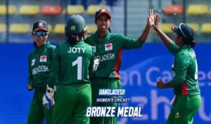 एशियाई खेलों में बांग्लादेश की महिला क्रिकेट टीम ने पाकिस्तान को हराकर ब्रॉन्ज मेडल अपने नाम किया। बांग्लादेश की गेंदबाजी शानदार रही थी और पाकिस्तान की पूरी टीम 64 रन भी बना सकी थी। लक्ष्य का पीछा करते हुए बांग्लादेश ने 19वें ओवर में जीत दर्ज की।