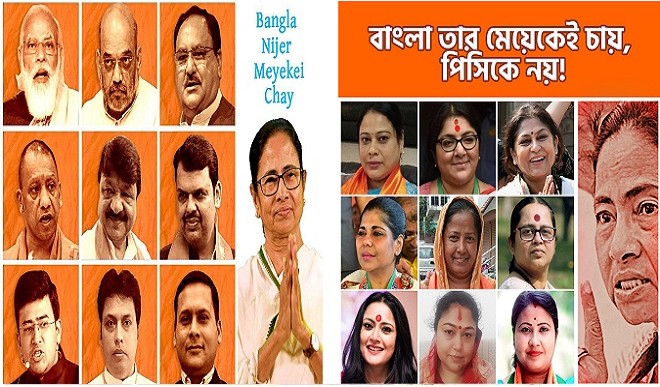 बीजेपी इस पोस्टर के जरिये ममता बनर्जी और उनके भतीजे अभिषेक बनर्जी की घेराबंदी की कोशिश कर रही है। इसलिए लिखा है कि बंगाल को बुआ नहीं चाहिए बल्कि अपनी बेटी चाहिए। बीजेपी ने अपनी महिला नेत्रियों का पोस्टर जारी किया है लेकिन सीएम चेहरे को लेकर अभी भी बीजेपी खेमे में खामोशी है। पोस्टर में रुपा गांगुली, देबोश्री चौधरी, लॉकेट चटर्जी, भारती घोष, अग्निमित्र पॉल शामिल हैं।