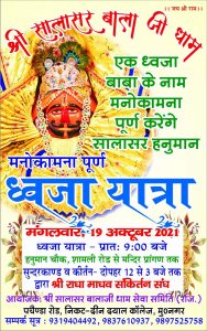 श्री सालासर बालाजी धाम मुजफ्फरनगर द्वारा "शरद पूर्णिमा" के शुभावसर पर 19 अक्टूबर दिन मंगलवार को प्रातः 9 बजे से आयोजित होगी पैदल मनोकामना पूर्ण ध्वजा यात्रा