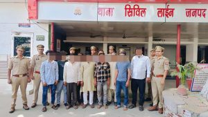 जनपद मुजफ्फरनगर में शातिर जुआरी अभियुक्तगण की गिरफ्तारी हेतु वरिष्ठ पुलिस अधीक्षक अभिषेक सिंह के निर्देशन में चलाये जा रहे अभियान के अन्तर्गत पुलिस अधीक्षक नगर श्री सत्यनारायण प्रजापत के निकट पर्यवेक्षण व सहायक पुलिस अधीक्षक/क्षेत्राधिकारी नगर ब्योम बिंदल एवं थाना प्रभारी सिविल लाईन ओमप्रकाश सिंह के नेतृत्व में आज दिनांक 20.04.2024 को थाना सिविल लाईन पुलिस द्वारा मकान में ताश के पत्तों से हार जीत की बाजी लगाकर जुआ खेलते हुए 10 अभियुक्तों को अभियुक्त नदीम के मकान से गिरफ्तार किया गया। अभियुक्तगण के कब्जे से 95960 रुपये नगद व 02 ताश की गड्डी बरामद की गयी। अभियुक्तों की गिरफ्तारी व बरामदगी के सम्बन्ध में थाना सिविल लाईन पुलिस द्वारा अग्रिम विधिक कार्यवाही की जा रही है।