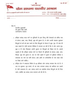 *उतराखंड के मुख्यमंत्री पुष्कर सिंह धामी को योग साधना आश्रम बघरा के महंत स्वामी यशवीर महाराज ने भेजा पत्र*