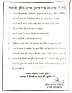 मुजफ्फरनगर पुलिस द्वारा सभी वाहन चालकों से भी अपील की जाती हैं कि वाहन चलाते समय यातायात के नियमों का पालन करें। वाहन चलाते समय मोबाईल का प्रयोग न करें तथा शीट बेल्ट व दोपहिया वाहन पर हेलमेट का प्रयोग करें। वाहन के सभी प्रपत्र तथा ड्राईविंग लाईसेन्स को डिजिल़ॉकर, एम-परिवहन एप पर अथवा अपने साथ रखें।