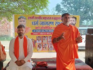 मुजफ्फरनगर के शाहदरा बांगर में रविवार को धर्म जागरण सभा का आयोजन हुआ जिसमे मुख्य वक्ता स्वामी यशवीर महाराज पीठाधीश्वर योग साधना यशवीर आश्रम बघरा ने सभा में आये हिन्दुओं को संबोधित करते हुए कहा की आज सनातन धर्म के साथ साथ सनातन धर्म के त्यौहारों की पवित्रता पर भी कट्टरपंथी लोगों के द्वारा खतरा मंडरा रहा है, इन कट्टरपंथी जेहादियों ने पहले भारत के हिन्दुओं को खाने पीने की वस्तुओं में थूक मूत्र मिलाकर के धर्म भ्रष्ट किया, अब ये थूकने मूतने वाला षडयंत्रकारी गैंग पूरे भारत में हिन्दुओं की पूजा पाठ के सामान को बेचने लगे है। ये कटृरपंथी हिन्दुओं की पूजापाठ के सामान पर भी थूक मूत्र व अन्य निकृष्ट पदार्थ लगाकर देते होंगे, उस खण्डित पूजा के सामान से हिन्दुओं को पूजा करने से कोई लाभ नहीं होगा।