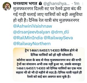 *मुजफ्फरनगर – रेल यात्री संघ के अध्यक्ष घनश्याम भगत ने दिल्ली रूट पर बंद की गई ट्रेनों को यात्रियों की सुविधाओं को ध्यान में रखते हुए चलाए जाने की मांग की*