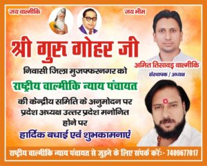 राष्ट्रीय वाल्मीकि न्याय पंचायत की केंद्रीय समिति के अनुमोदन पर , प्रदेश मंत्री अमित वाल्मीकि, व राष्ट्रीय वाल्मीकि न्याय पंचायत के संस्थापक अमित तीसावर के निर्देश पर मुज़फ्फरनगर से गुरु गौहर वाल्मीकि को राष्ट्रीय वाल्मीकि न्याय पंचायत उत्तर प्रदेश का प्रदेश अध्यक्ष बनाया गया सर्वसमाजिक गुरु गौहर को सभी समाज की तरफ से लोगो के द्वारा दी गई शुभकामनाए