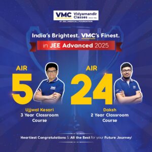 इंजीनियरिंग प्रवेश परीक्षा की तैयारी में उत्कृष्टता का पर्याय बन चुके विद्यामंदिर क्लासेज़ (VMC) ने एक बार फिर अपने बेहतरीन प्रदर्शन से खुद को साबित किया है। आज घोषित हुए JEE एडवांस्ड 2025 के परिणामों में VMC के दो होनहार छात्र उज्ज्वल केसरी और दक्ष ने क्रमशः ऑल इंडिया रैंक (AIR) 5 और AIR 24 हासिल कर संस्थान को गौरवांवित किया है।