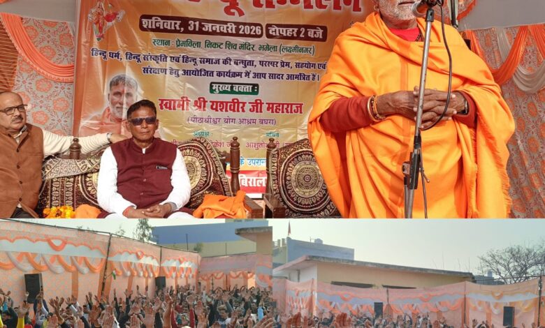 दिनांक 31 जनवरी को जनपद मुजफ्फरनगर के चरथावल क्षेत्र के गांव भमेंला में Rss के शताब्दी वर्ष के निमित्त हिंदू सम्मेलन हुआ मुख्य वक्ता के रूप में स्वामी यशवीर महाराज ने हिंदू सम्मेलन को संबोधित करते हुए सब प्रकार के जेहाद पर करारा प्रहार किया लक्ष्मीनगर के जिला संघ चालक डा तेजवीर जी ने पंच परिवर्तन विषय को हिन्दू सम्मेलन में रखा सफल आयोजन के लिए हिन्दू सम्मेलन समिति का ह्रदय से धन्यवाद हिन्दू सम्मेलन में उपस्थित होने वाले सभी हिन्दू वीर वीराग्नाओं का भी धन्यवाद