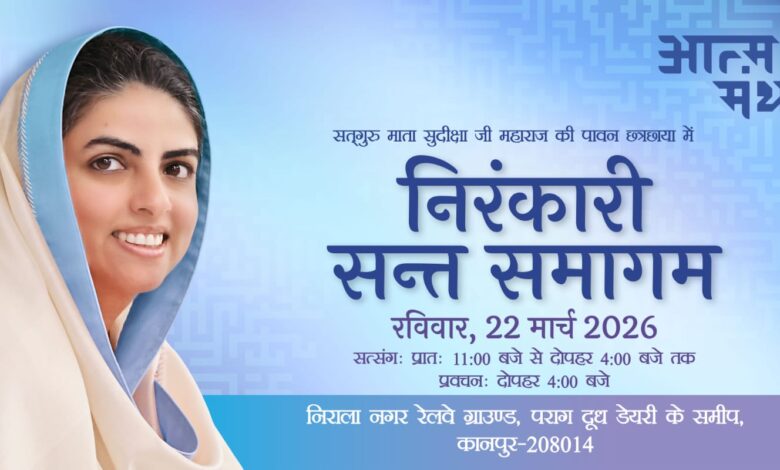 सतगुरु माता सुदीक्षा जी महाराज एवं निरंकारी राजपिता रमित जी की दिव्य एवं करुणामयी छत्रछाया में 22 मार्च 2026 को कानपुर के निराला नगर स्थित रेलवे ग्राउंड (पराग डेयरी के समीप) में उत्तर प्रदेश का भव्य राज्य स्तरीय निरंकारी संत समागम श्रद्धा, समरसता और आध्यात्मिक उल्लास के साथ आयोजित किया जाएगा। यह पावन आयोजन मानवता, विश्वबंधुत्व और आध्यात्मिक जागृति का प्रेरणास्रोत बनेगा।