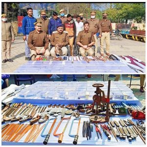 तमंचा फैक्ट्री से 52 तमंचे व 70 जिंदा कारतूस भारी मात्रा में तमंचे बनाने के उपकरण बरामद।