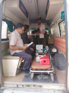 नोडल अधिकारी ने 108 एंबुलेंस में ऑक्सीजन, कंस्यूमेबल , मेडिकल इक्विपमेंट एवं इमरजेंसी दवाई का बारीकी से निरीक्षण किया । ईएमटी की दक्षता जांच करने हेतु उन्होंने ईएमटी से कुछ सवाल भी पूछे और सारे इक्विपमेंट चलवा के चेक किए। नोडल अधिकारी ने अपने सामने 108 के प्रोग्राम मैनेजर राजेश रंजन का बीपी चेक करवा कर ईएमटी की दक्षता की जांच की।